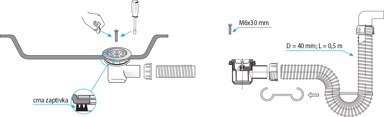 - adapter prečnika 40mm za kanalizacionu cev 50mm ili adapter prečnika 29/32mm za olovnu cev 5/4,